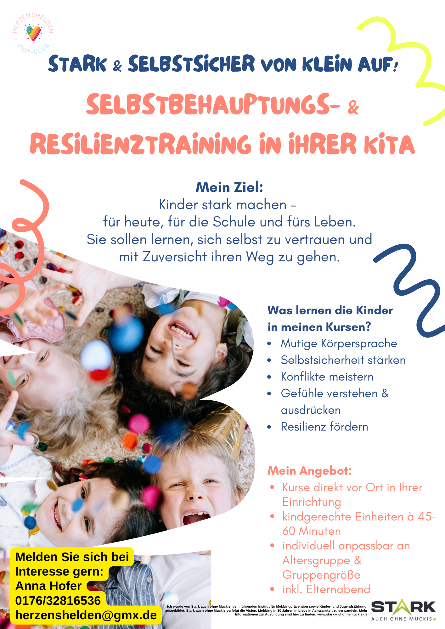 und Kitas zu unterstützen. Mein Herzensthema ist es, Kinder zu stärken. In meinen einzigartigen Trainings fördere ich durch Spiel, Spaß und Bewegung die Selbstsicherheit, Selbstliebe und den Mut der Kinder.